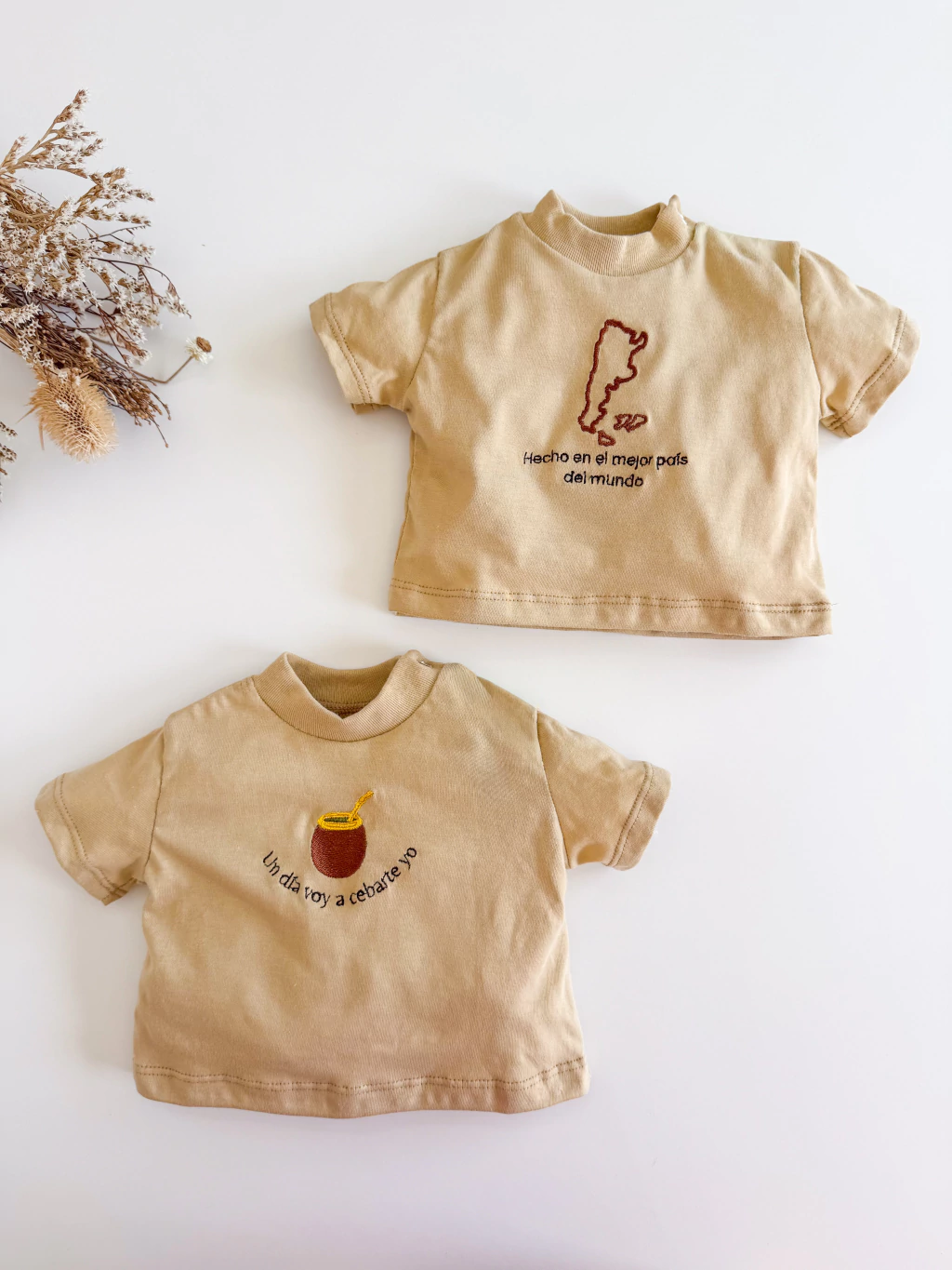 Pack de dos remeras de jersey de algodón, con bordados especiales que celebran la cultura y el amor por nuestro país. Incluye una con el matecito y la frase “Un día voy a cebarte yo” y otra con el mapa de Argentina y Malvinas junto a la frase “Hecho en el mejor país del mundo”.
