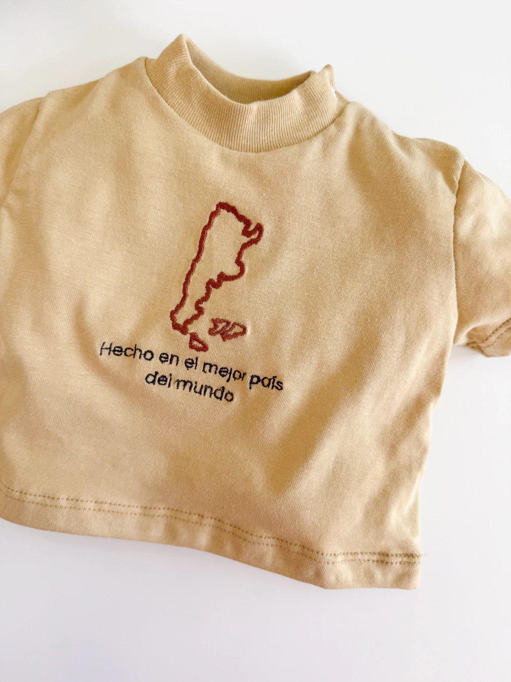Remera de jersey de algodón con un bordado especial del país Argentina y Malvinas, acompañada de la frase “Hecho en el mejor país del mundo”. Ideal para mostrar orgullo y estilo en cada momento.