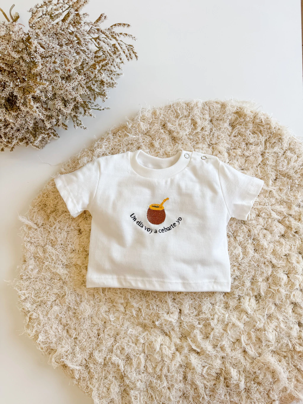 Remera de jersey de algodón con un bordado tierno de un matecito y la frase “Un día voy a cebarte yo”. Perfecta para transmitir ternura y tradición en cada look.