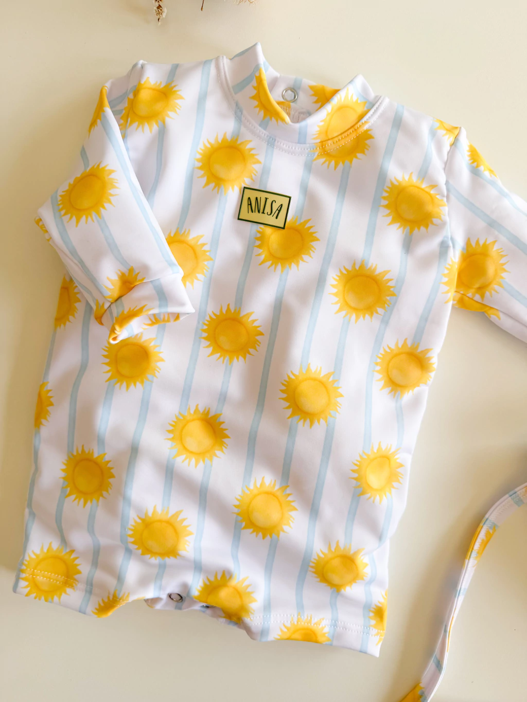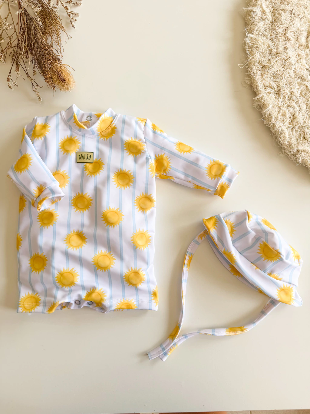 Traje de baño enterito para bebé con protección UV +50 y anticloro, diseñado para disfrutar del agua con seguridad y comodidad. Con mangas largas, broches en el pañalero para facilitar el cambio y una gorrita de regalo para mayor protección.